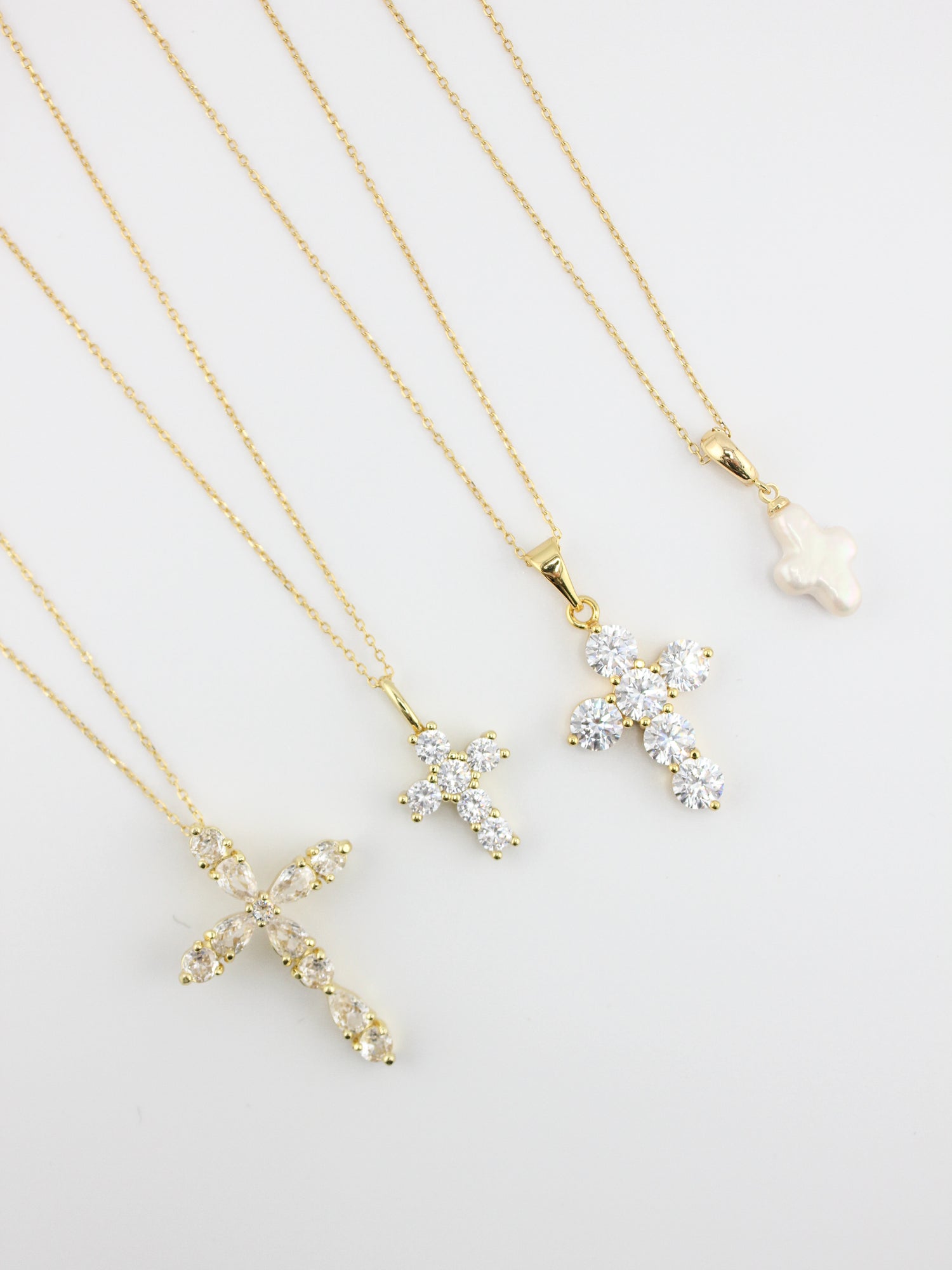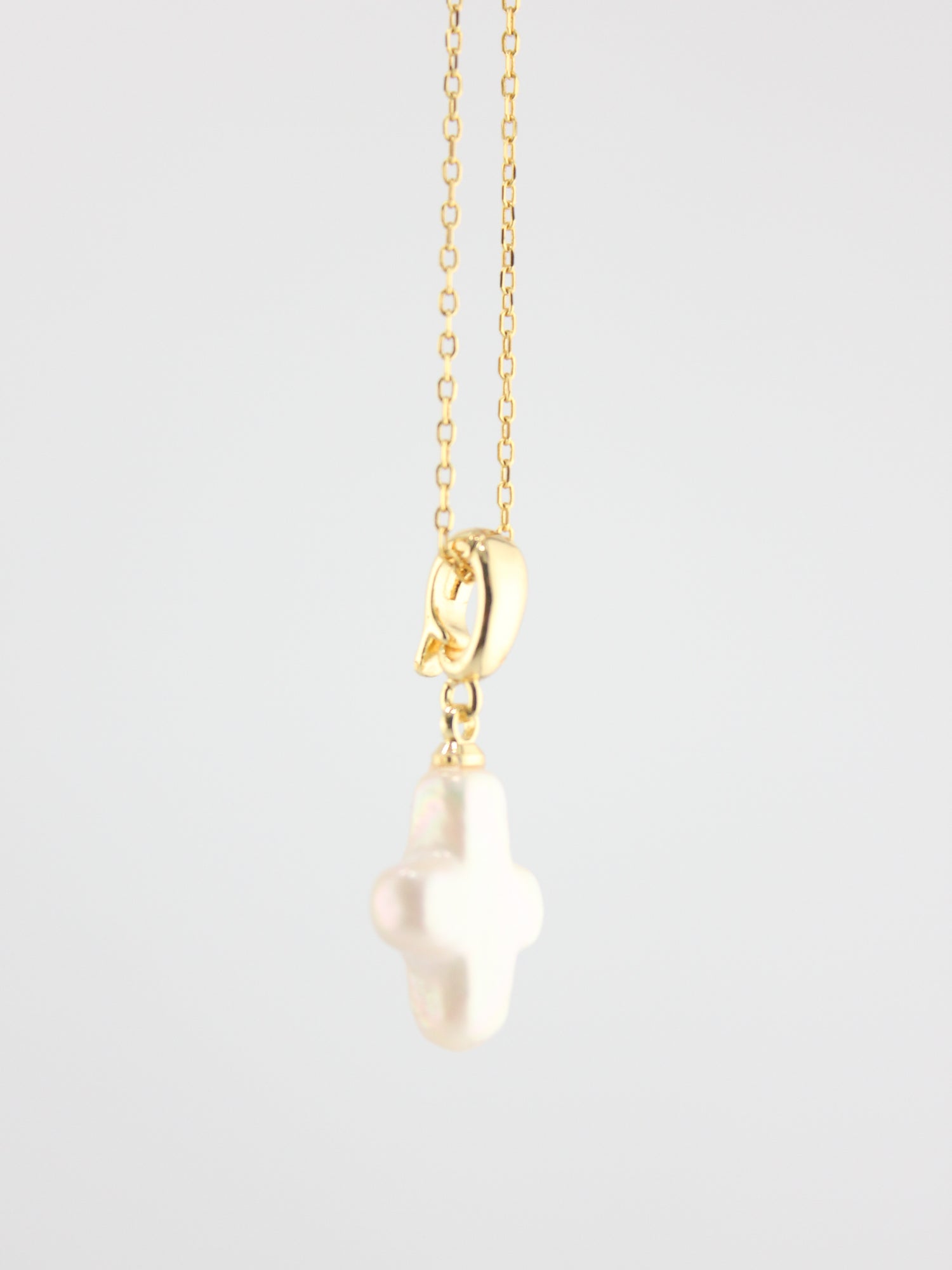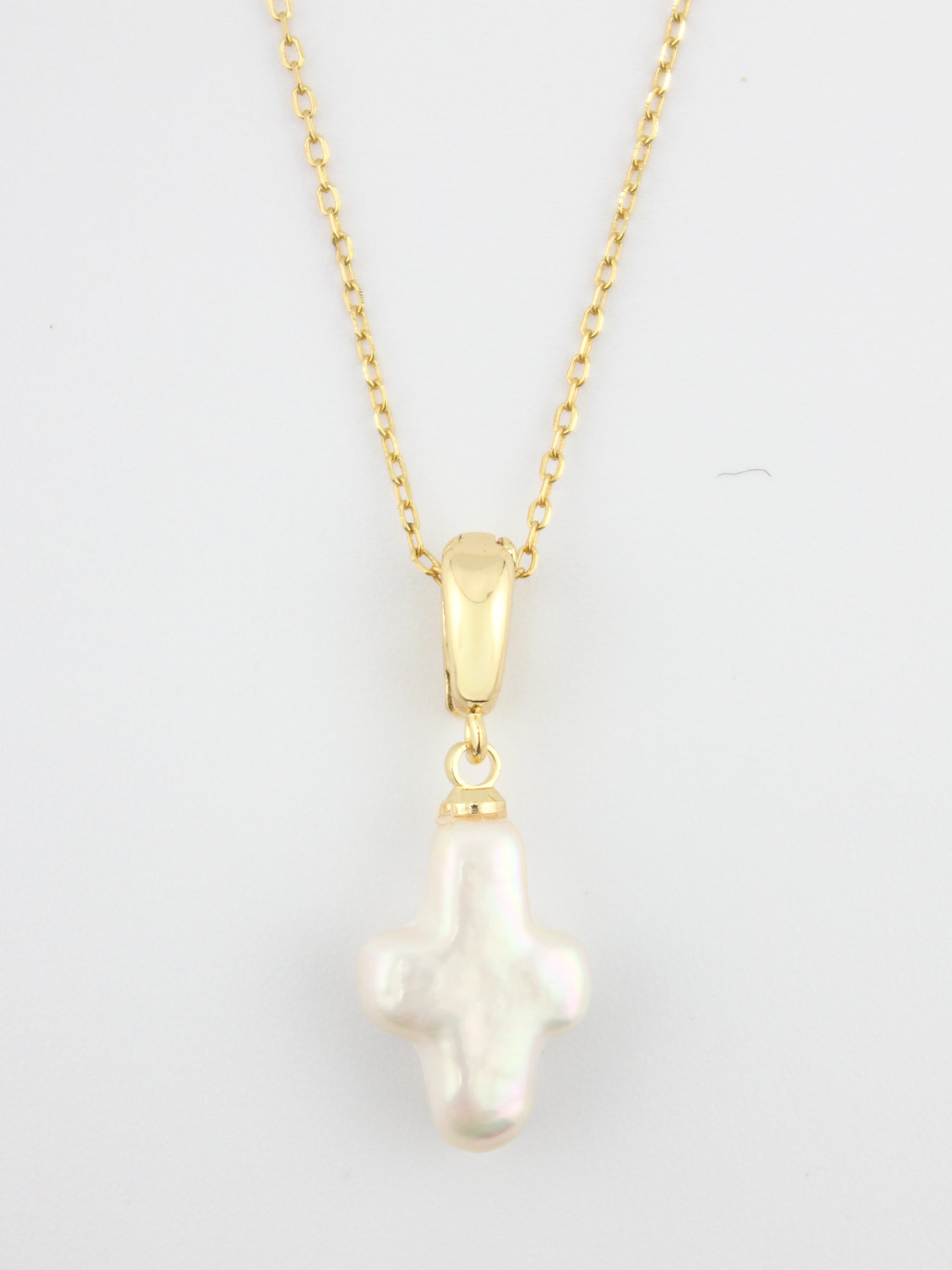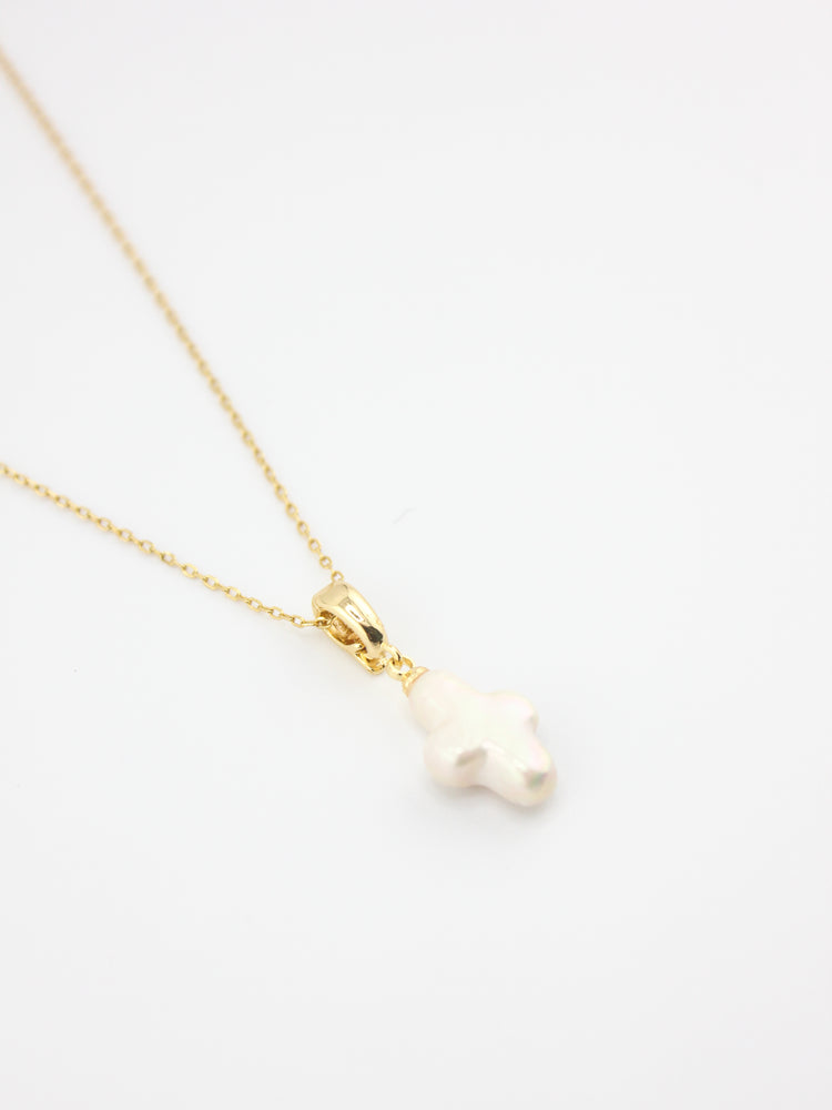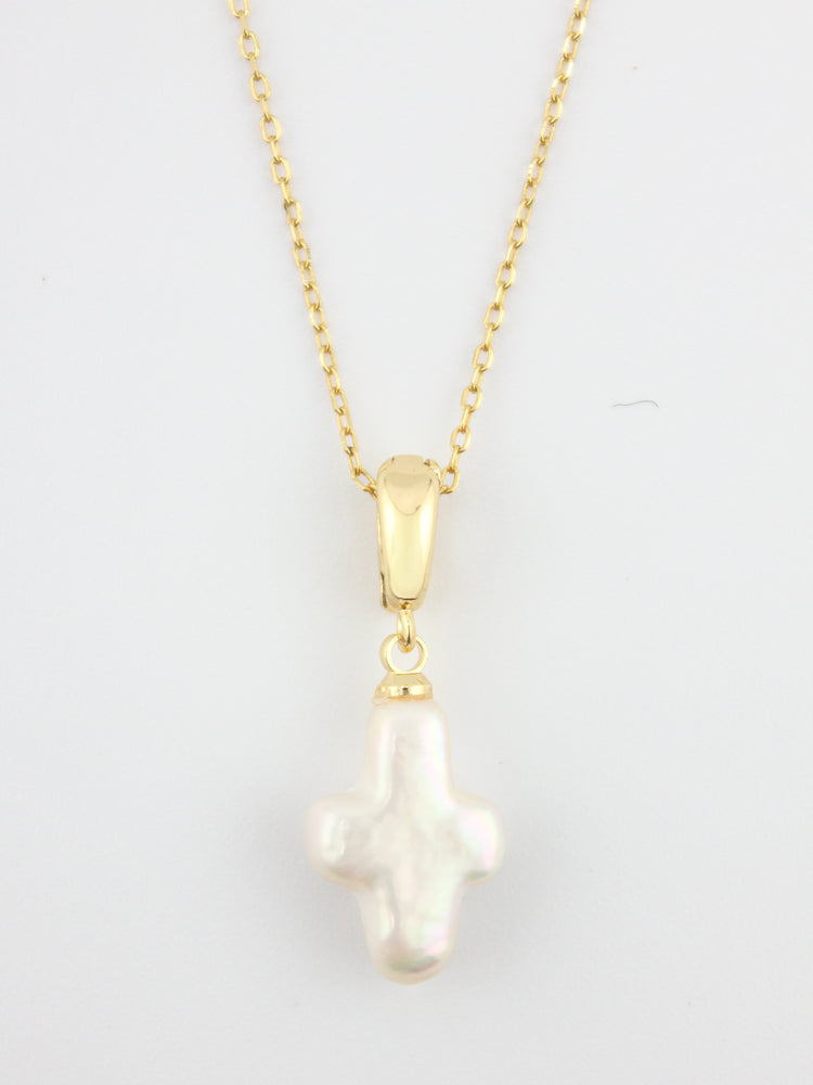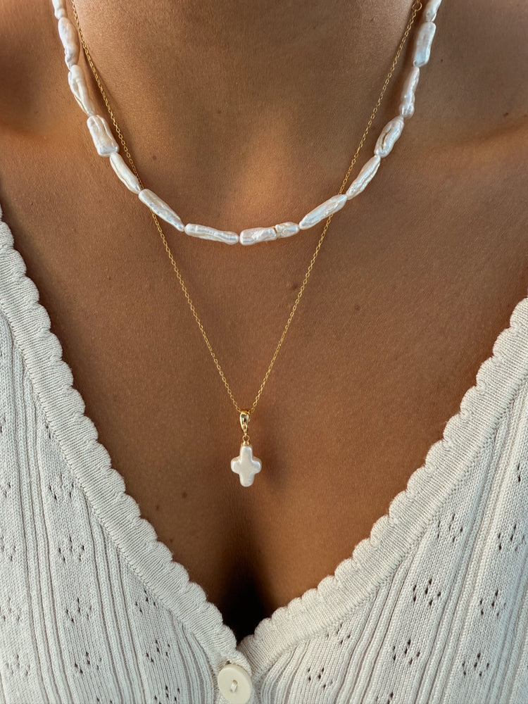 Soft elegance with timeless meaning. The Cruz Perla Necklace features a delicate cross charm crafted from luminous freshwater pearl, suspended from a fine gold chain. Each piece is subtly unique, celebrating imperfection and natural beauty — a modern heirloom designed to be worn close to the heart.