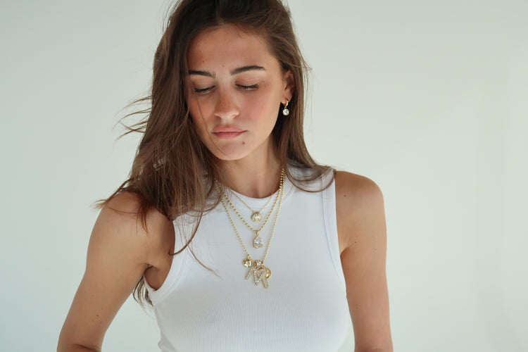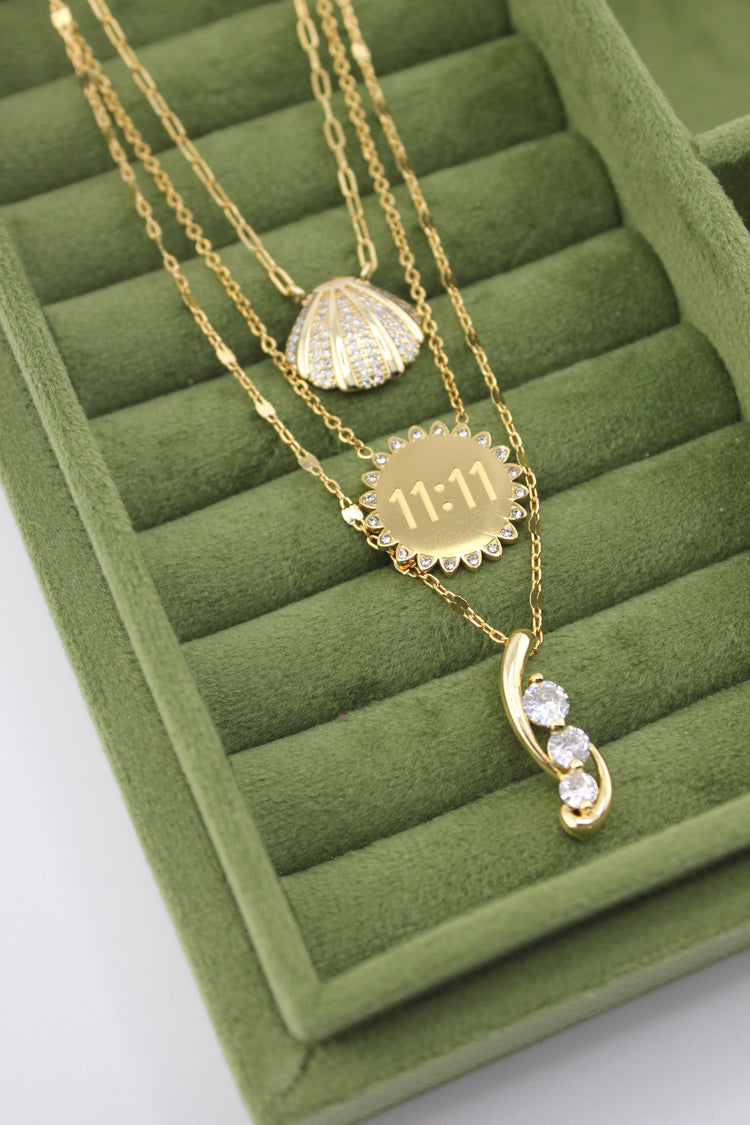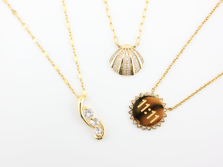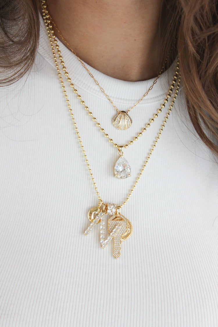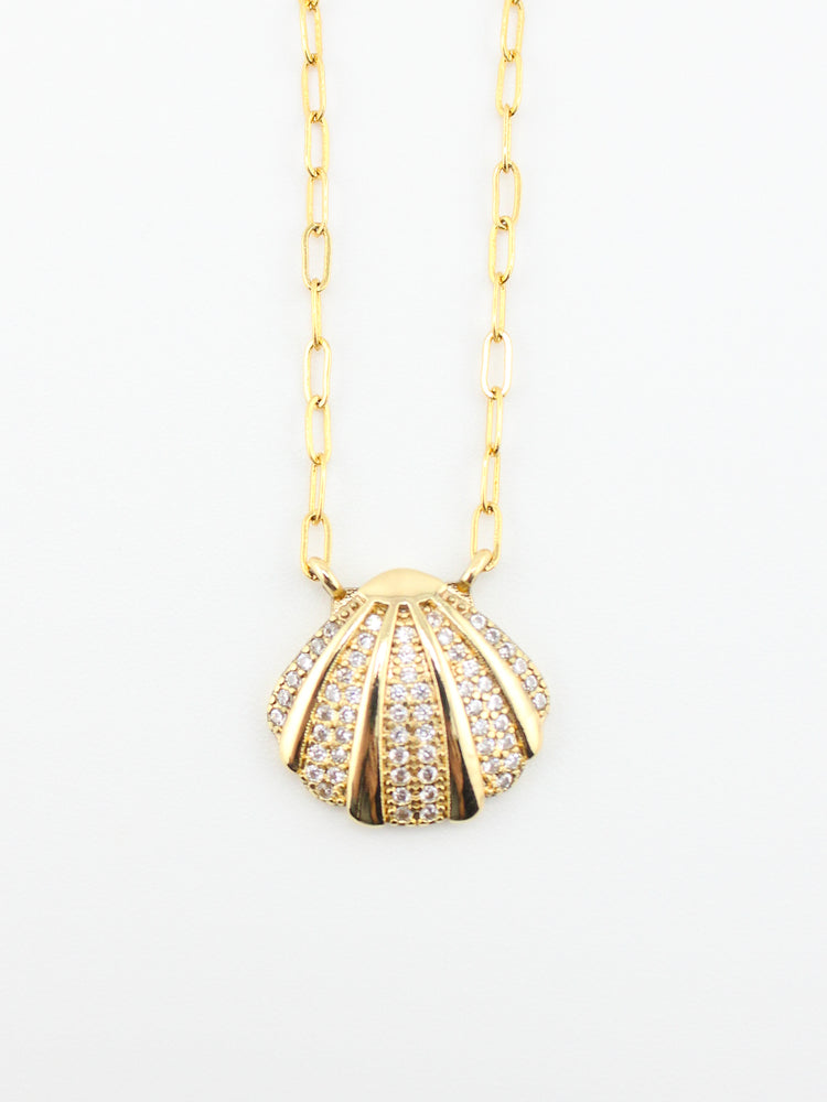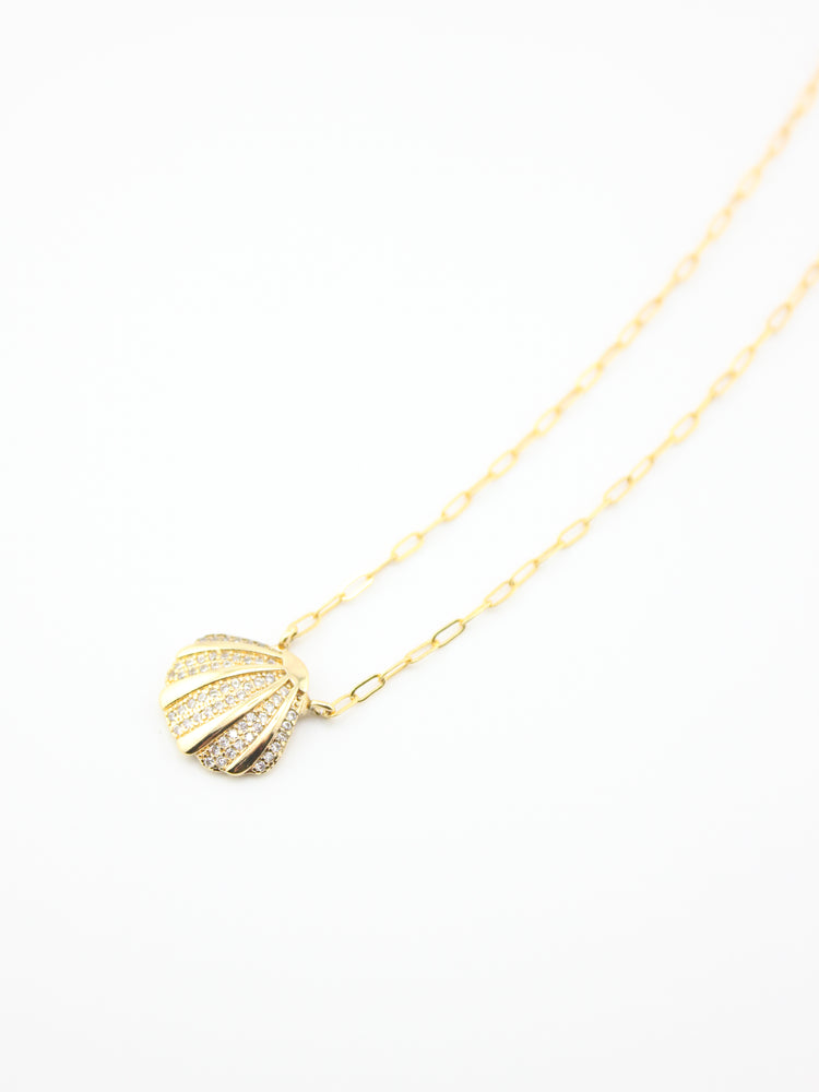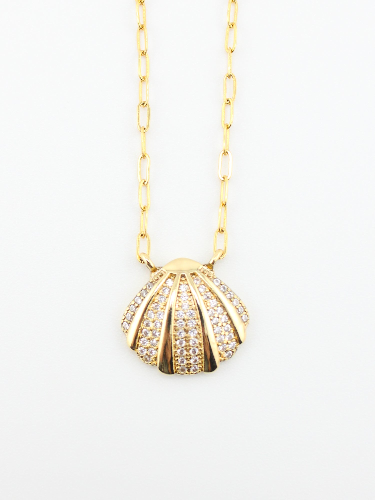 A nod to winter escapes. A pavé shell pendant on a refined rectangle link chain—elevated coastal energy.
