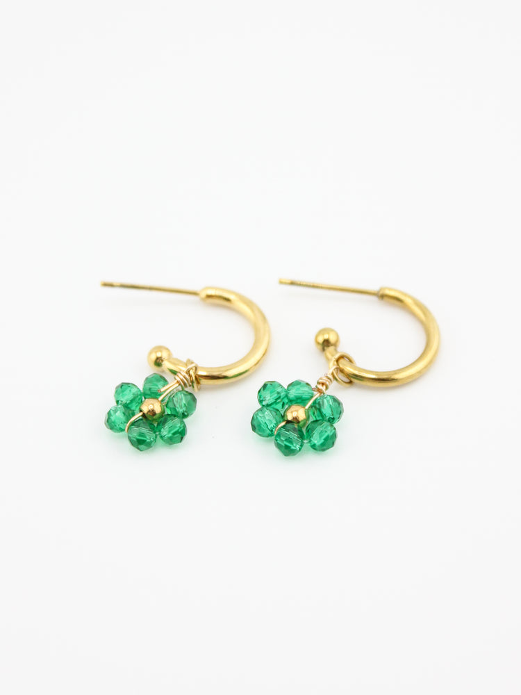 Materials: emerald glass beads, gold‑plated findings, stainless posts
