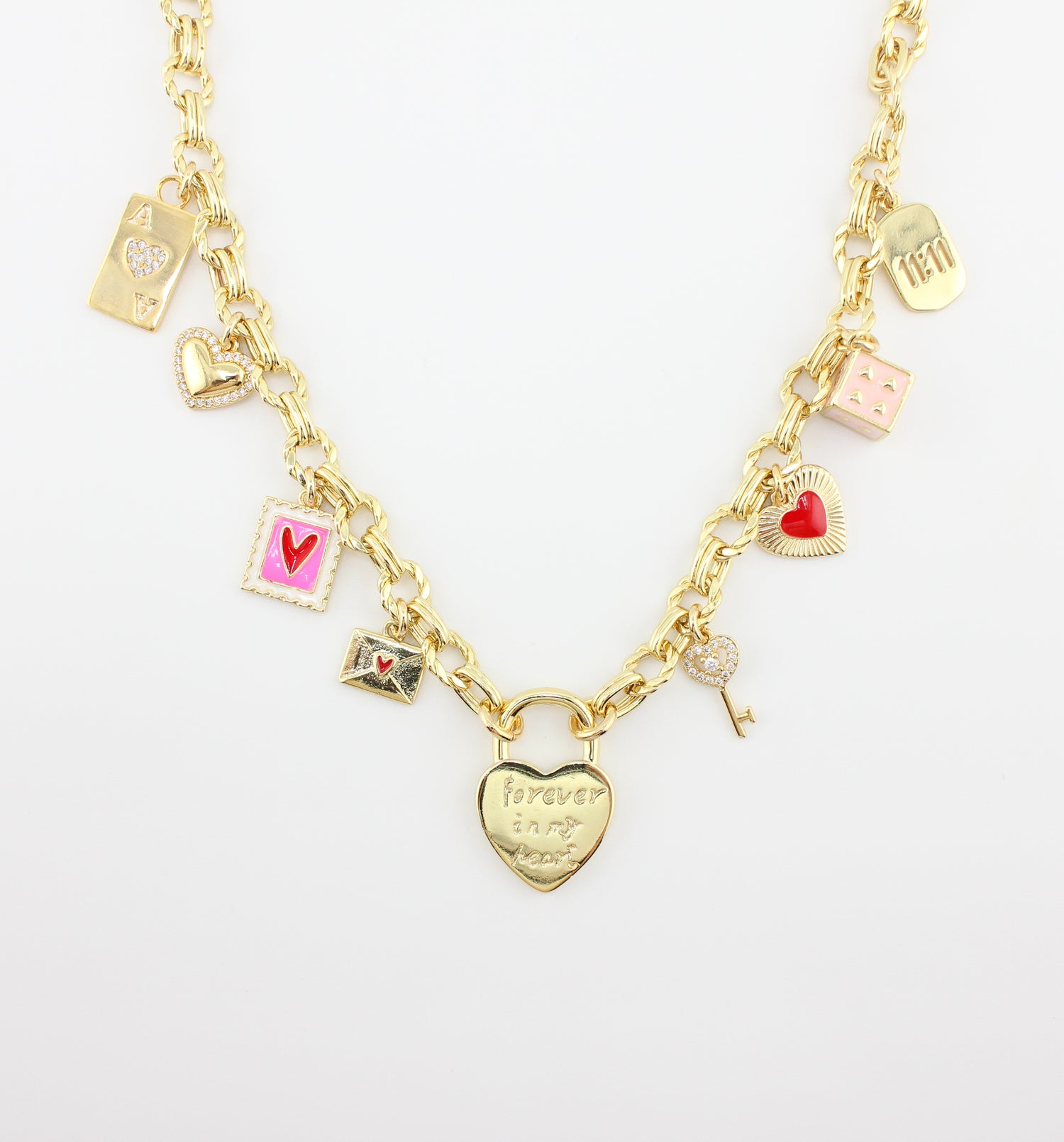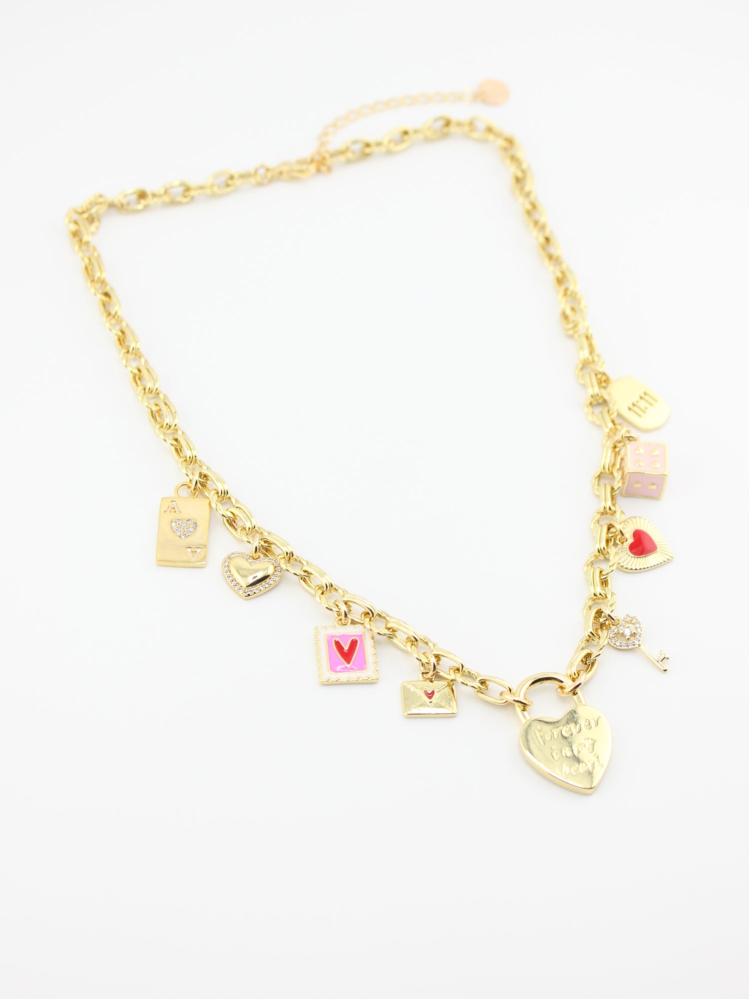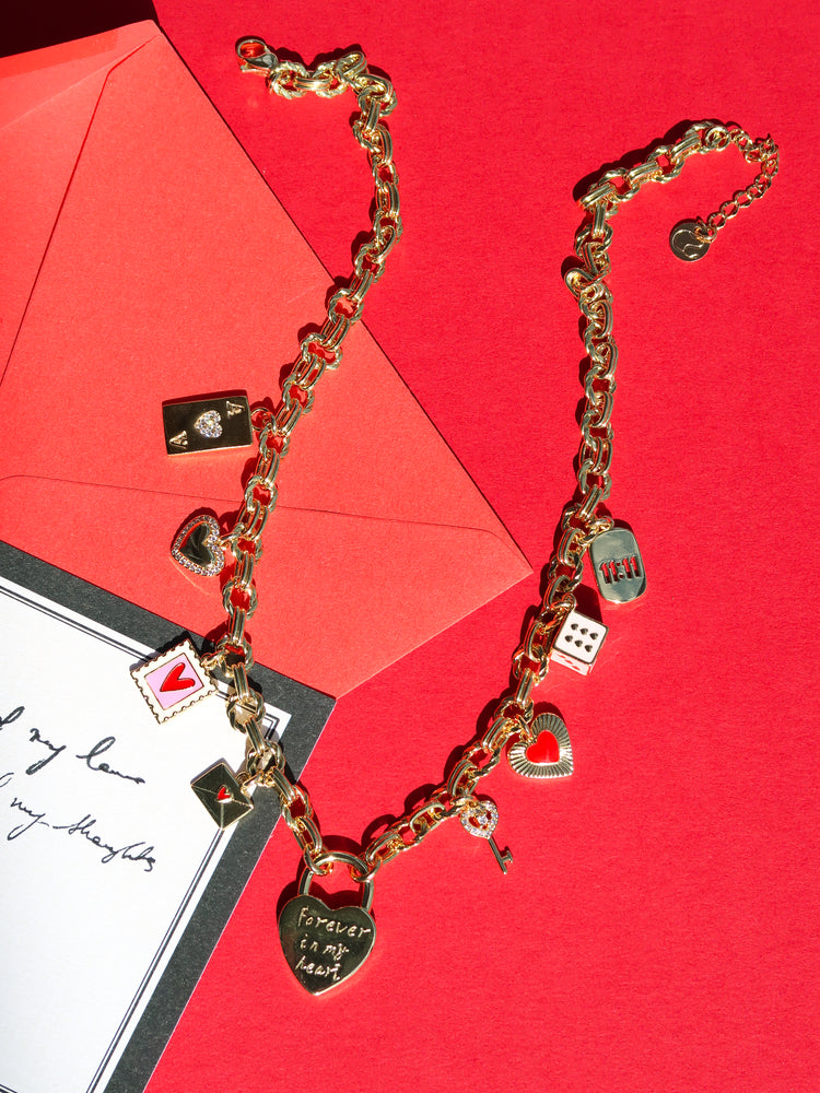 Bold charm with heartfelt storytelling. The Love Token Necklace features a statement gold chain scattered with heart, letter, and love-symbol charms. Each charm carries meaning, creating a piece that feels playful, nostalgic, and deeply personal — a modern talisman for romantics at heart.
