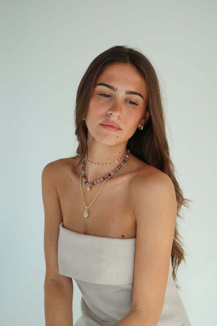 Playful color with polished shine. Pastel heishi beads are accented with a clear crystal drop for a joyful take on winter layering.