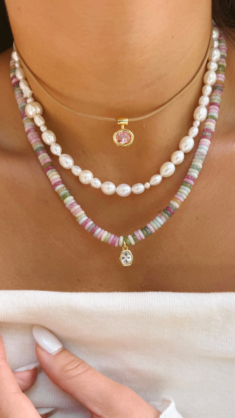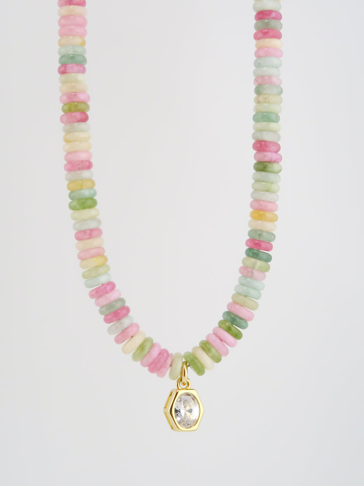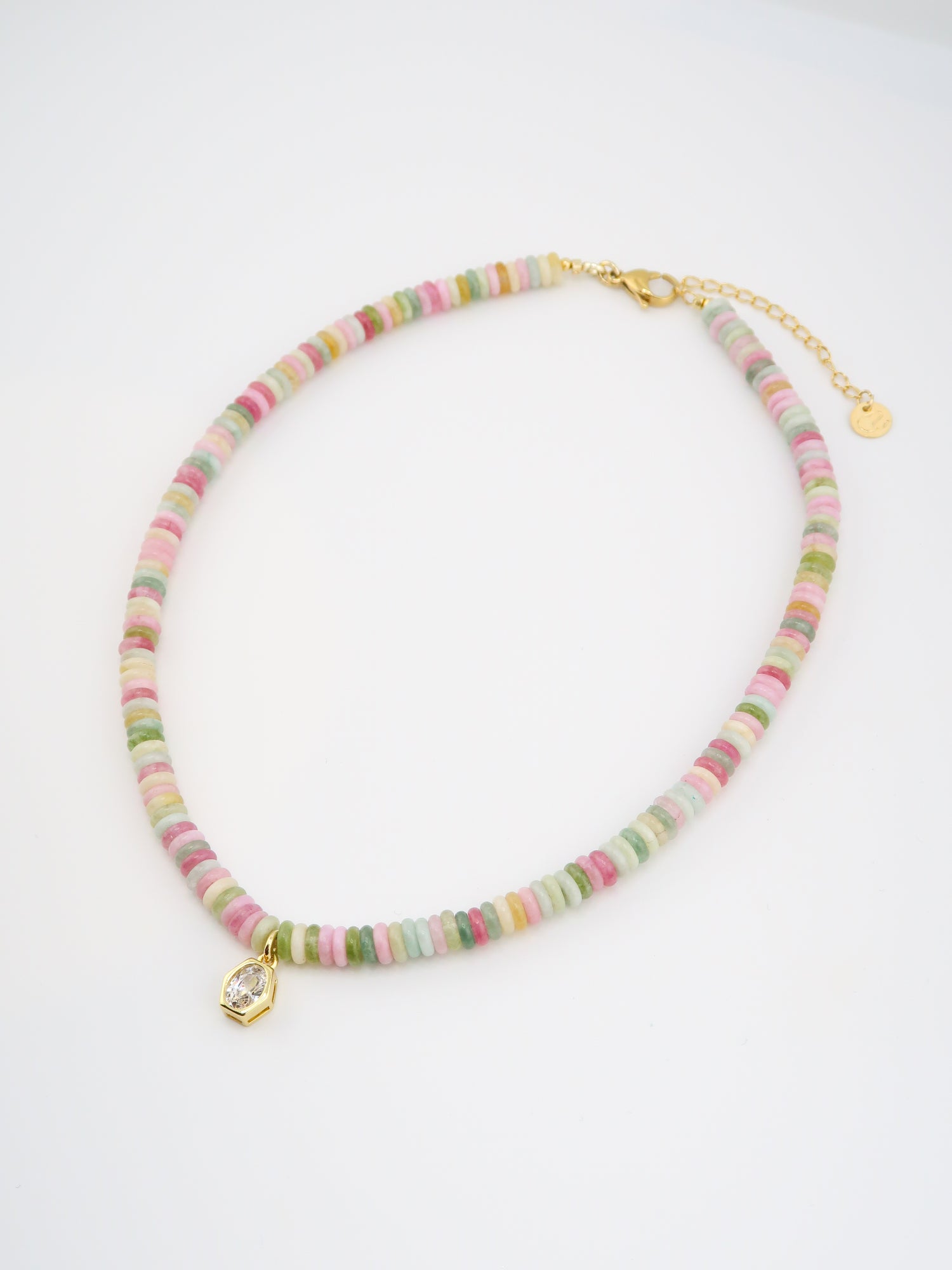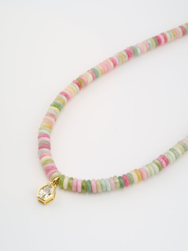 Materials: pastel polymer heishi beads, gold findings, clear crystal bezel pendant