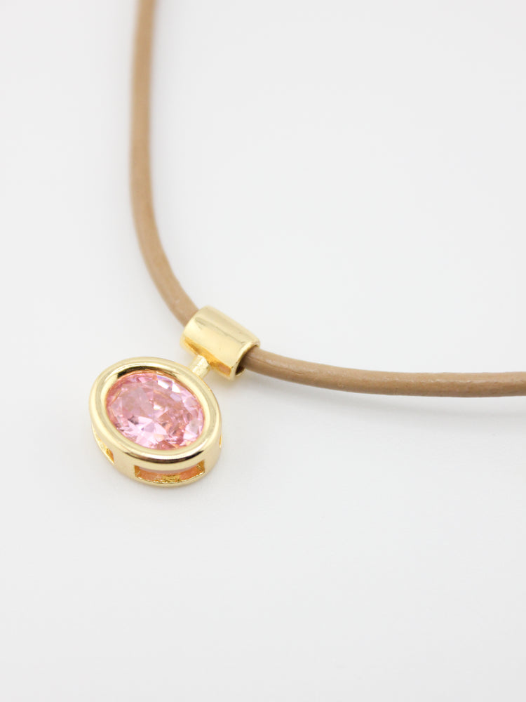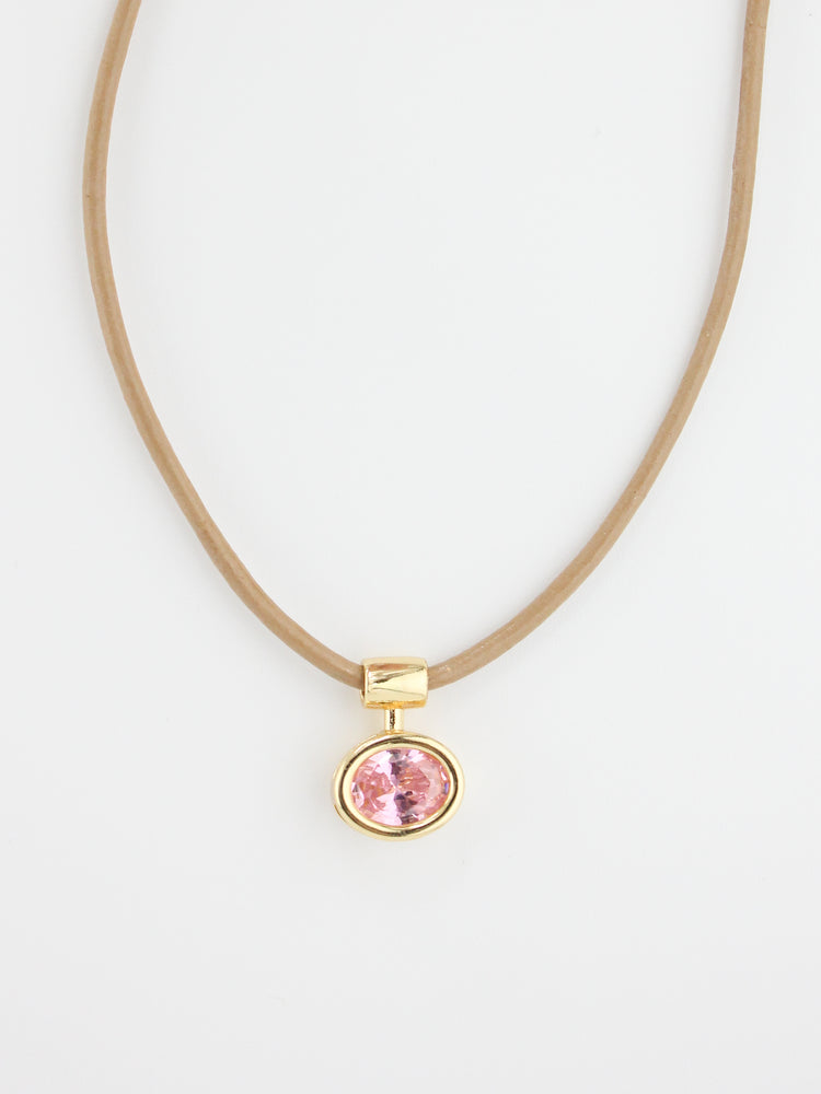 Materials: 2mm beige leather cord, gold‑plated cap ends, blush pink faceted stone bezel