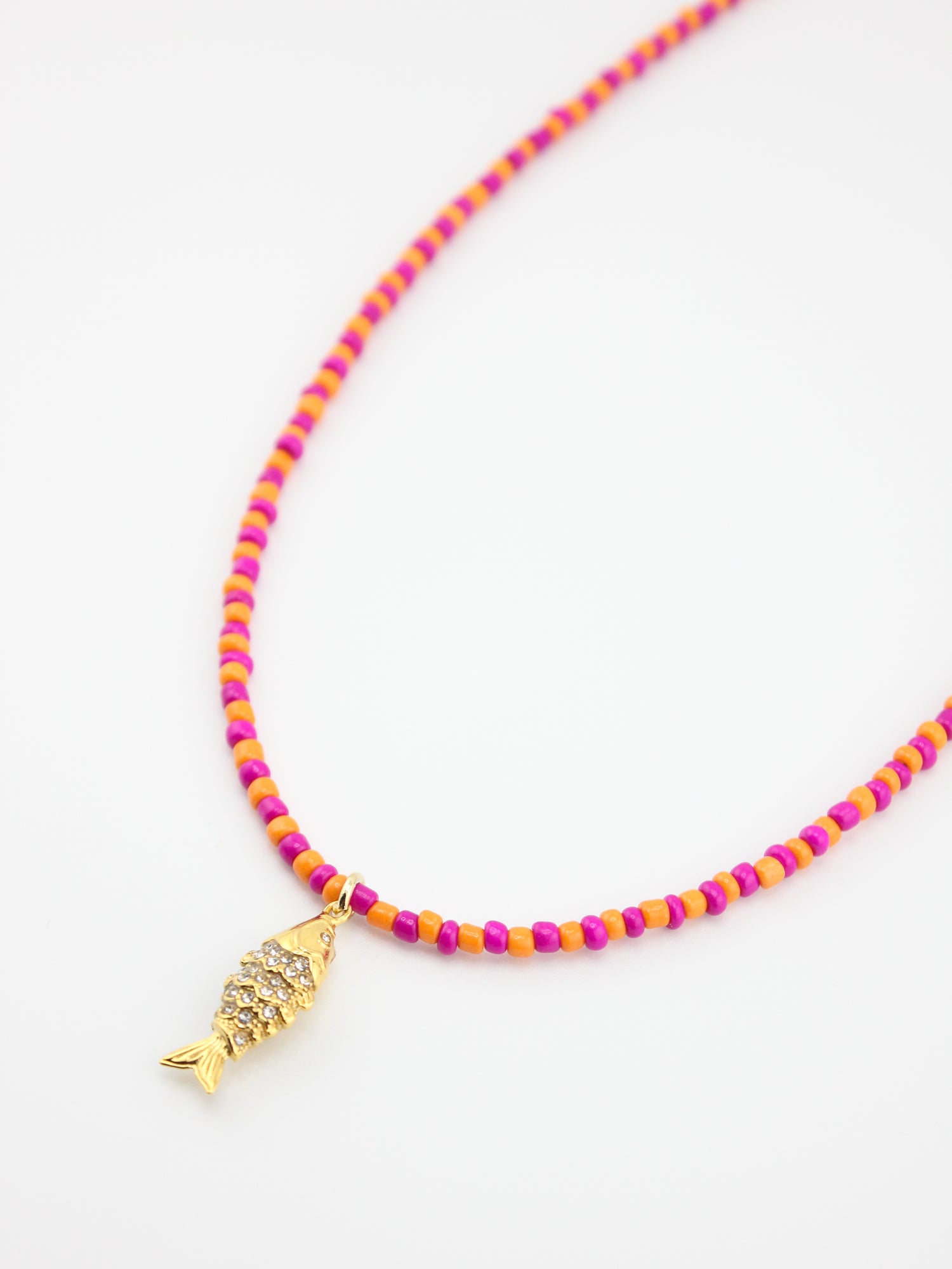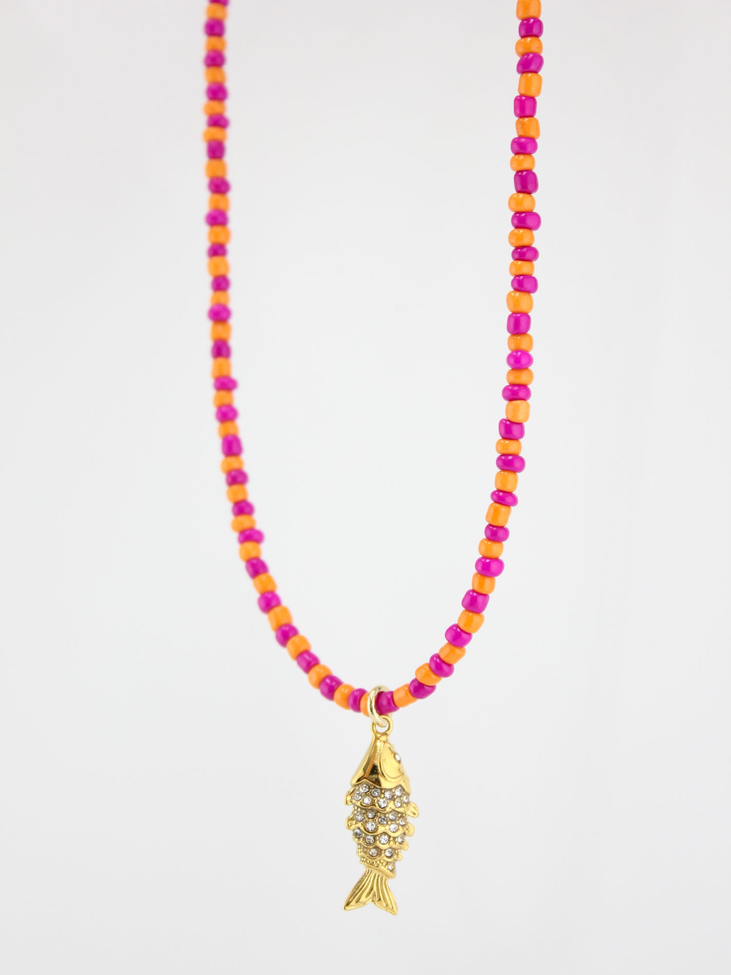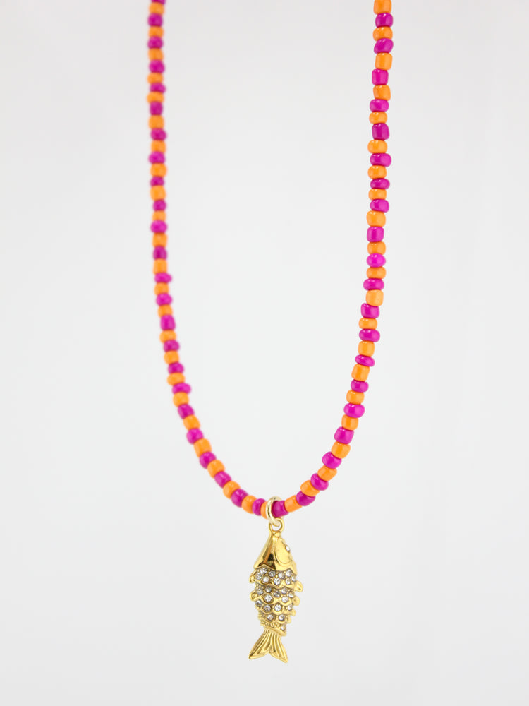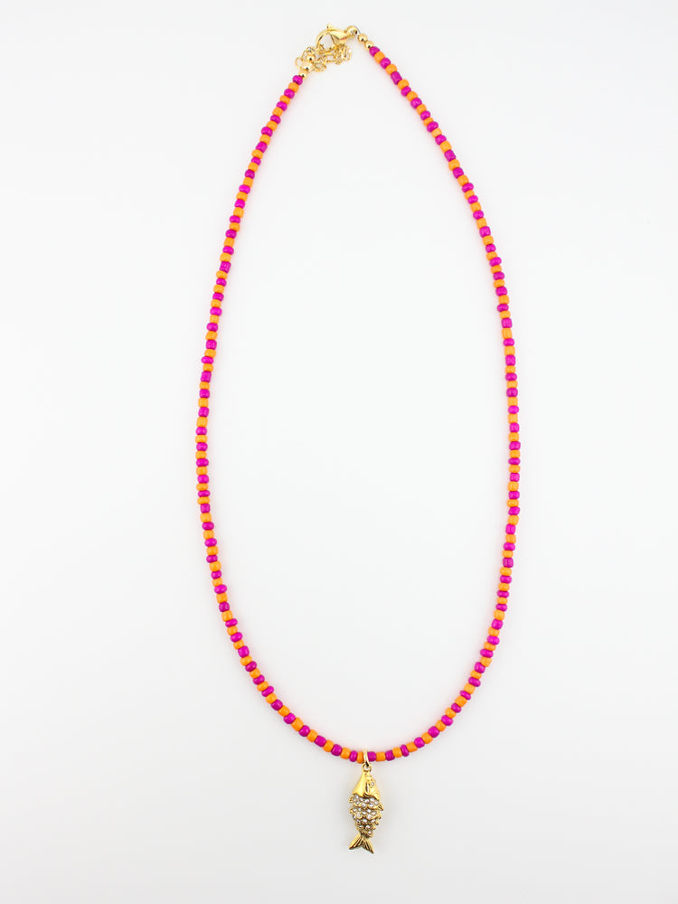 Bright, bold, and full of playful charm, the Coral Reef Catch Necklace combines pink and orange seed beads with a gleaming gold fish charm. Inspired by vibrant coral gardens and the treasures they hide, this necklace is the perfect pop of color for long summer days and ocean-side nights.