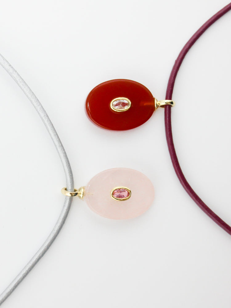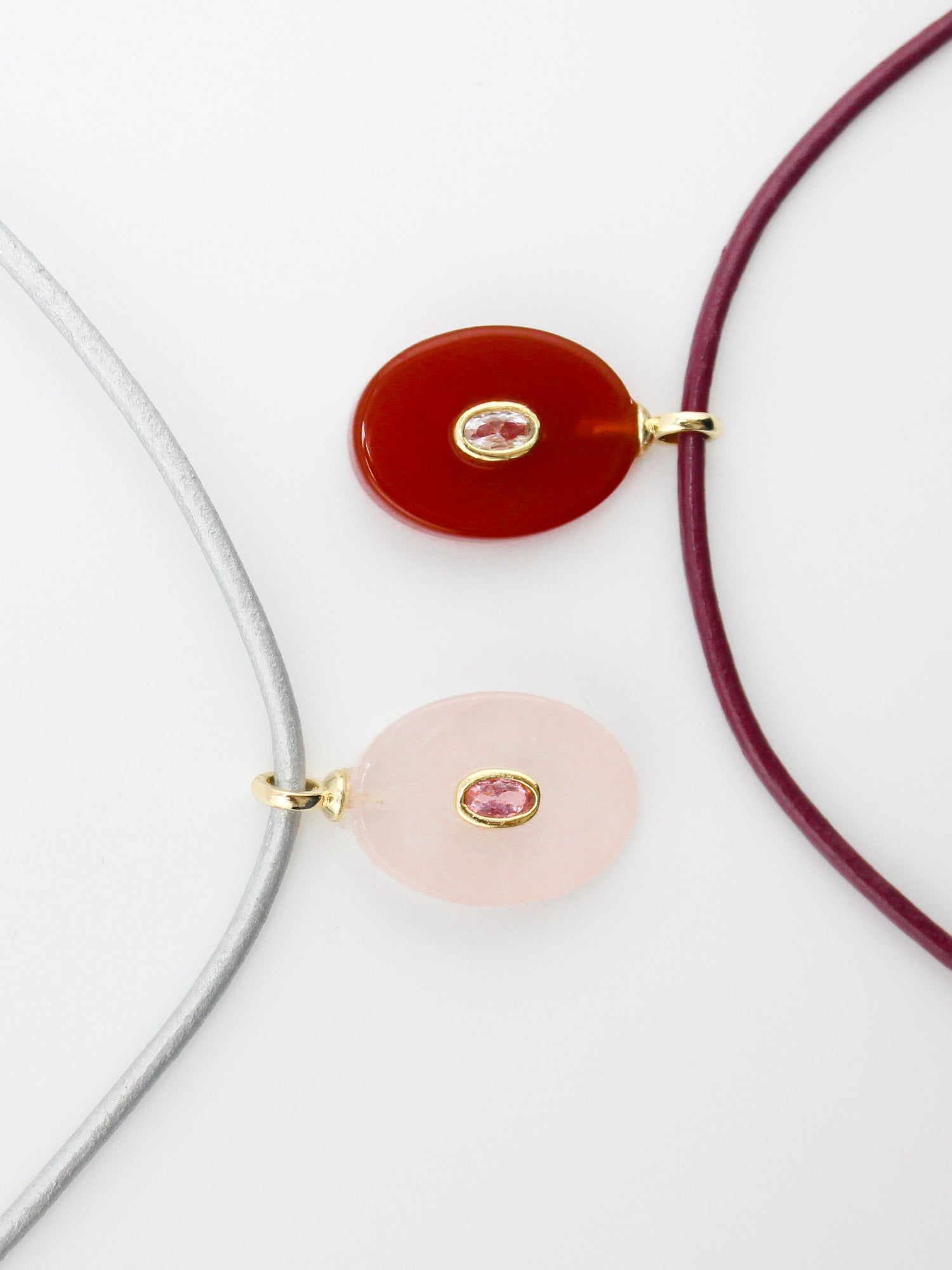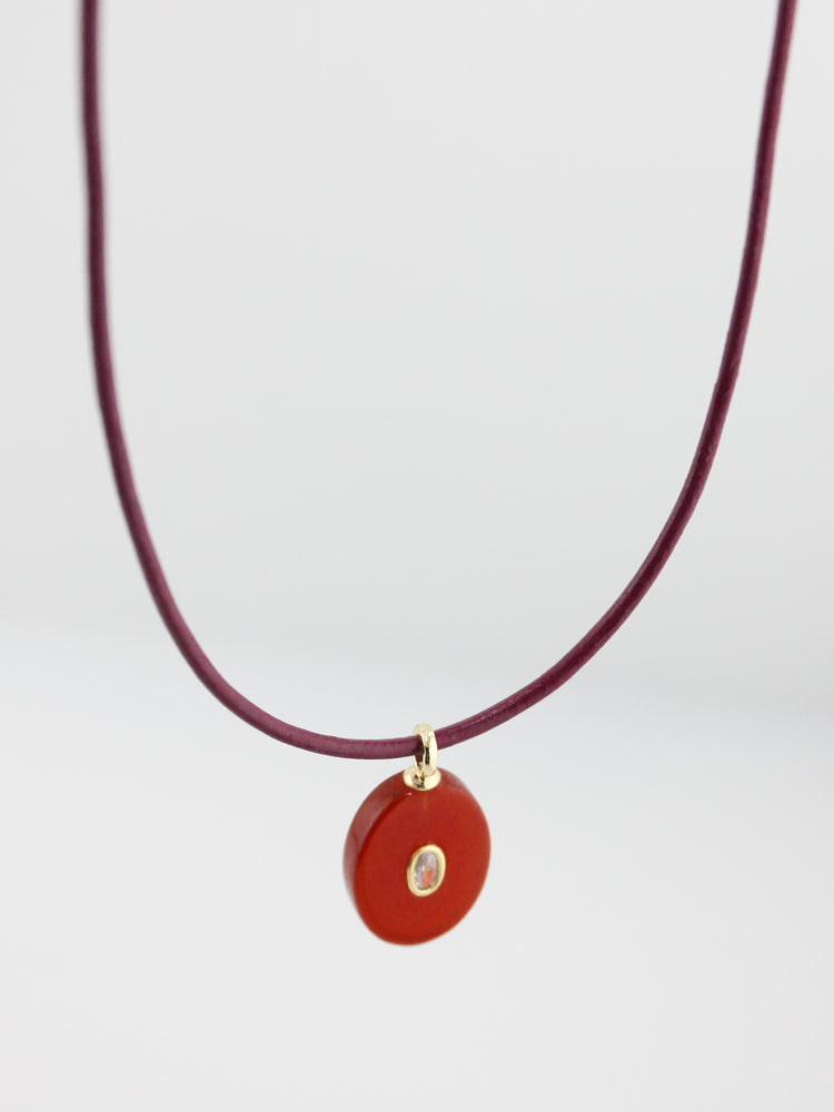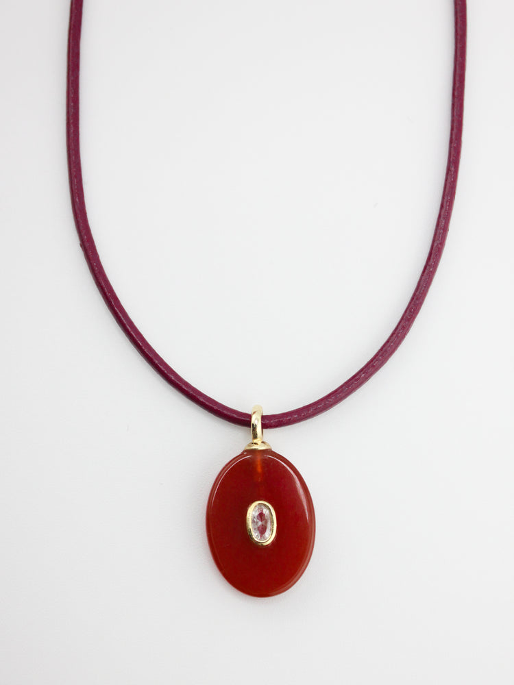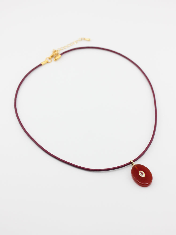Materials: 2mm burgundy leather cord, gold‑plated cap ends, oval red gemstone bezel