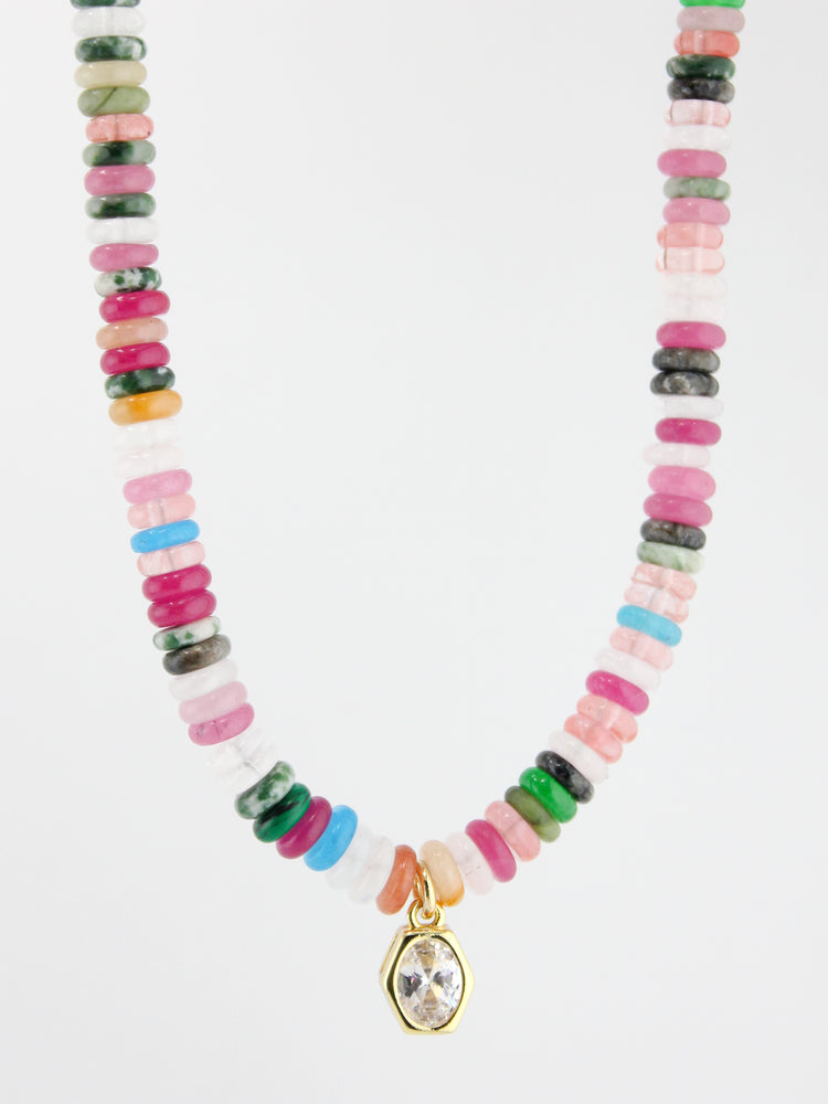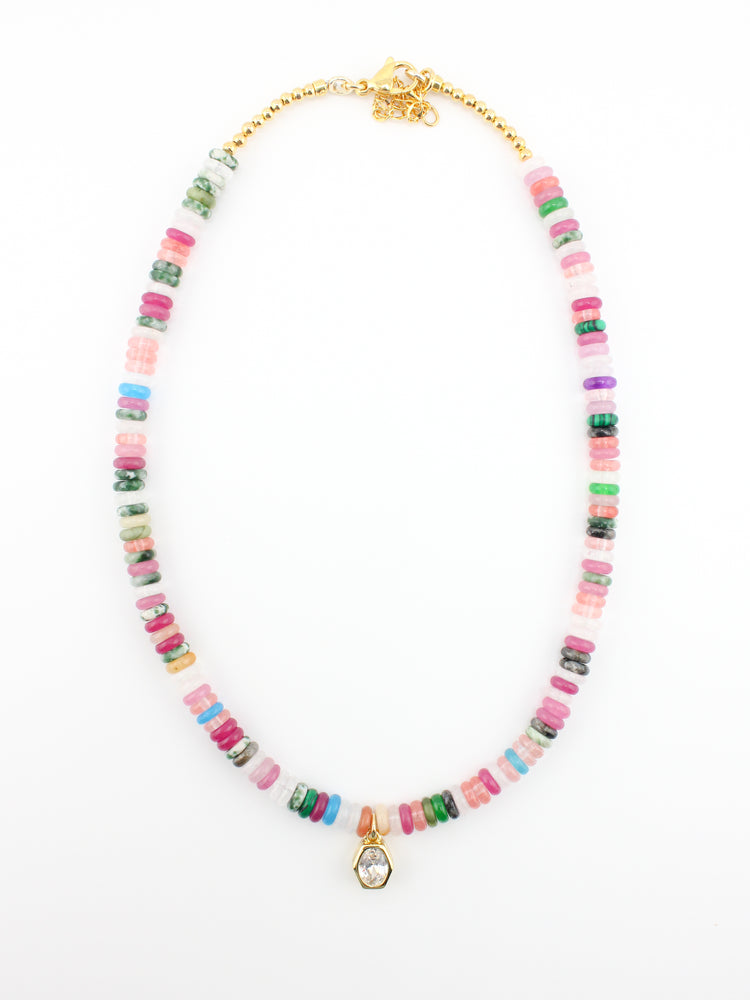 Playful color with polished shine. Pastel heishi beads are accented with a clear crystal drop for a joyful take on winter layering.