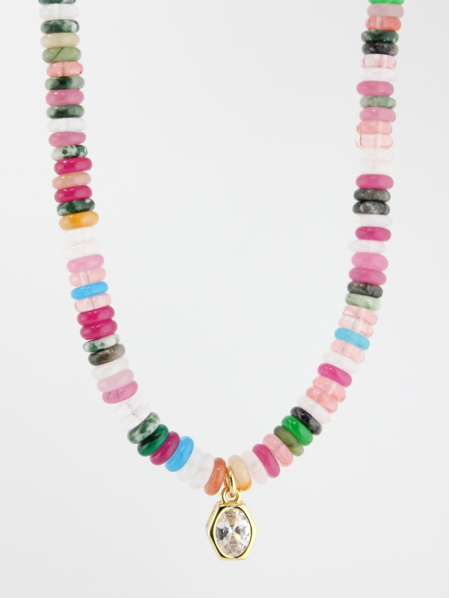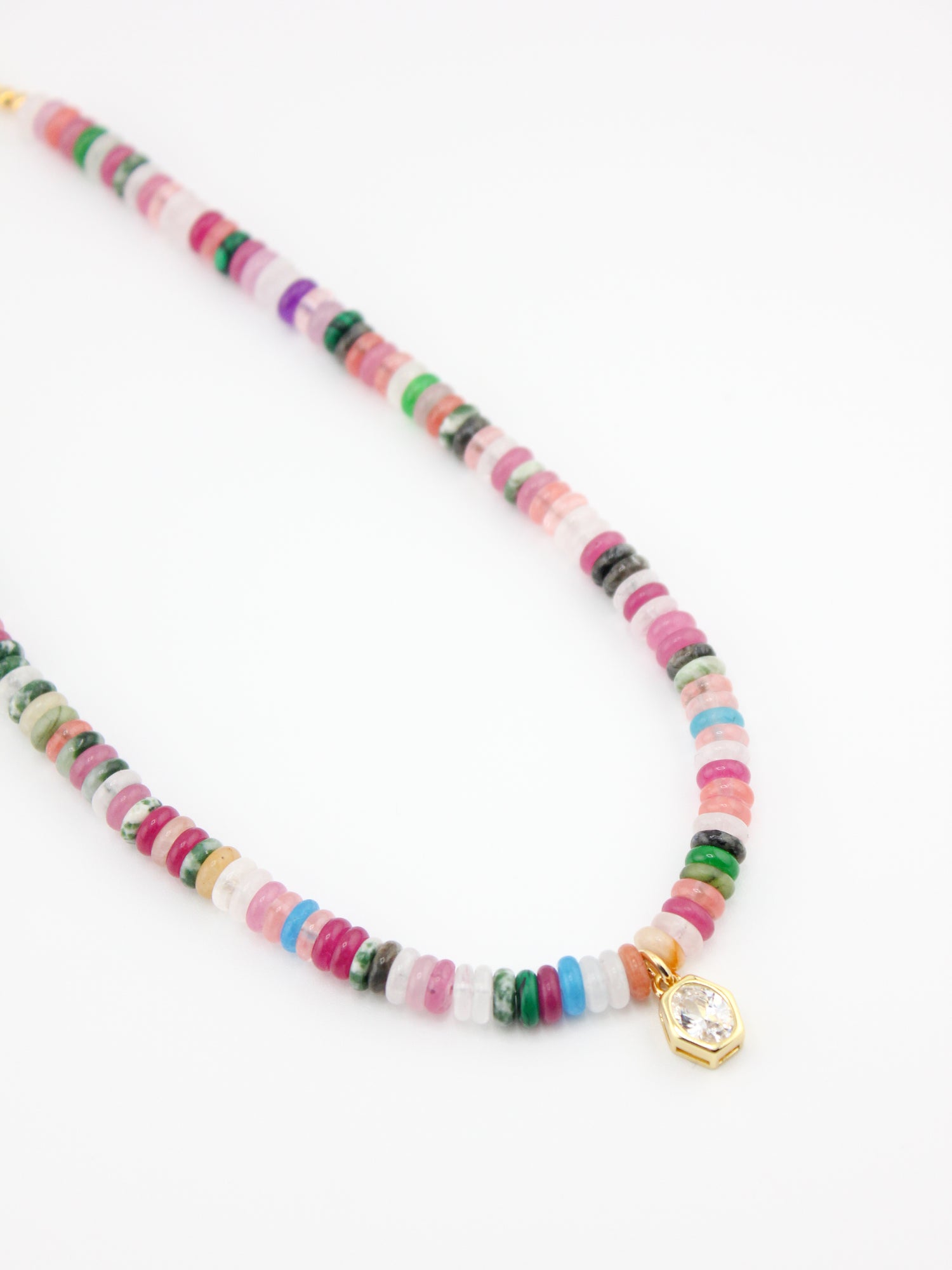 Materials: pastel polymer heishi beads, gold findings, clear crystal bezel pendant