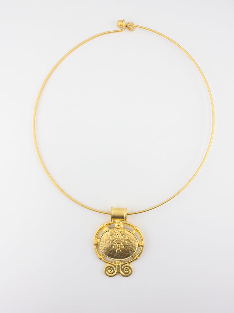 The Helios Necklace is a striking ode to ancient sun gods and modern icons alike. Featuring a hammered gold medallion suspended from a minimalist torque collar, this statement piece blends Greco-Roman elegance with architectural edge. Sculptural, radiant, and unapologetically bold, perfect for sun-drenched cities or island soirées.